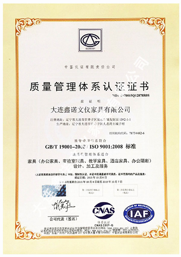 大連鑫諾文儀家具有限公司總部位于中國的北方明珠-大連。公司以教育設備,家具裝飾裝修為主導產業。經過近10年的發展,又涉及科學實驗設備工程、教育裝備工程、圖書館裝備工程、教學儀器等各類家具的生產與研發。 公司建設了大型生產基地,總面積超過一萬平方米,員工150多人。經全體員工多年的不懈努力,公司已發展成為在大連、沈陽擁有多家公司和生產基地,并在國內擁有多家聯營公司的科、工、貿為一體的綜合性實業企業。 鑫諾家具實業已通過ISO9001:2000國際質量管理體系認證,ISO14001:2004國際環境管理體系認證。公司堅持走品牌發展路線。旗下產品和服務有“家具名牌”“家具著名品牌”等多項榮譽。其品牌大部分已遍布東北三省、山東省等地,涉及十幾個行業等上萬家企業單位和高校